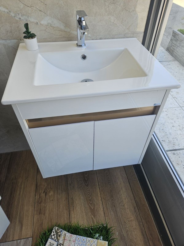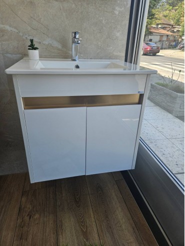 Moderan beli ormarić sa dvoje vrata i integrisanim keramičkim umivaonikom, praktičan prostor za odlaganje.