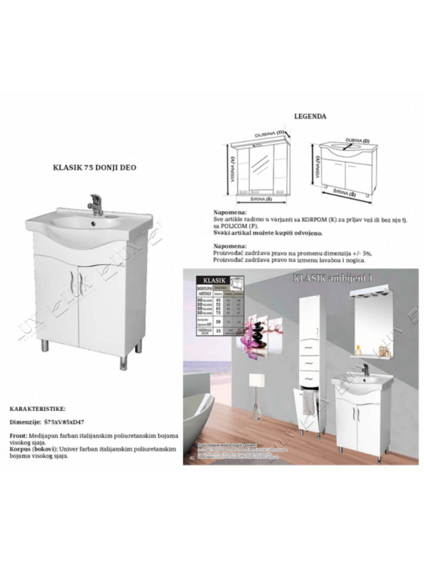 Kupatilski ormarić donji Lux Kontesa Klasik 75 je elegantan kupatilski ormarić, bele boje, visokog sjaja, dimenzija 75x47x85cm. Kupatilski ormarić donji Lux Kontesa Klasik 75 je napravljen od univera i medijapana, prekrivenog italijanskim poliuretanskim bojama. Kupatilski ormarić donji Lux Kontesa Klasik 75 je postavljen na nožice, koje olakšavaju čišćenje i pranje ispod elementa. Osim što sakriva donji deo lavaboa, ormar je praktično rešenje za odlaganje pribora i kućne hemije.