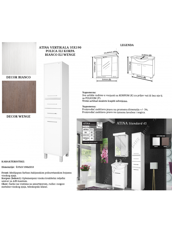 Kupatilski ormarić vertikala Lux Atina 35x190 korpa je funkcionalni ormarić, dimenzija 35x190x33cm. Unutrašnjost ormana čine korpa za odlaganje prljavog veša, pozicionirana na dnu ormana, zatim 2 fioke i odeljak sa policama za odlaganje krupnijih predmeta. Kupatilski ormarić vertikala Lux Atina 35x190 korpa je napravljen od kombinacije medijapana i kvalitetnog univera sa ABS kantom. Ručke kao i nogari su od metala visokog sjaja, šarke su urađene sa amortizerima, a orman je, radi veće ugodnosti upotrebe, izrađen sa teleskopskim klizačima. Kupatilski ormarić vertikala Lux Atina 35x190 korpa je dostupan u dve boje: braon i beloj.
