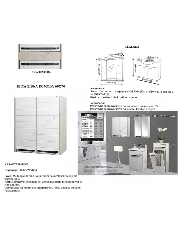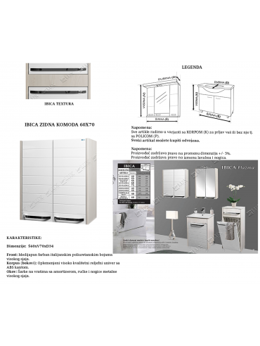Kupatilski ormarić zidna komoda Lux Ibica 60x70 je zidni element specijalno kreiran za uslove povećane vlažnosti koji vladaju u kupatilu. Kupatilski ormarić zidna komoda Lux Ibica 60x70 je napravljen do medijapana zaštićenog italijanskom poliuretanskom bojom visokog sjaja, sa ručkama od metala i šarkama sa amortizerima. Bokovi ormarića su napravljeni od oplemenjenog visoko kvalitetnog reljefnog univera sa ABS kantom. Unutrašnjost kupatilskog ormarića je komotna i omogućava jednostavnu organizaciju pribora i kozmetike. Dimenzije kupatilskog ormarića zidna komoda Lux Ibica 60x70 iznose 60x70x34cm.