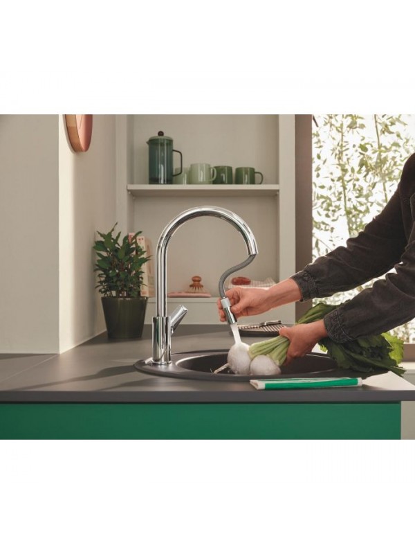 Moderna, jednoručna baterija za sudoperu sa izvlačnim tušem, prepoznatljiva po visokom rotirajućem izlivu i hrom finišu.