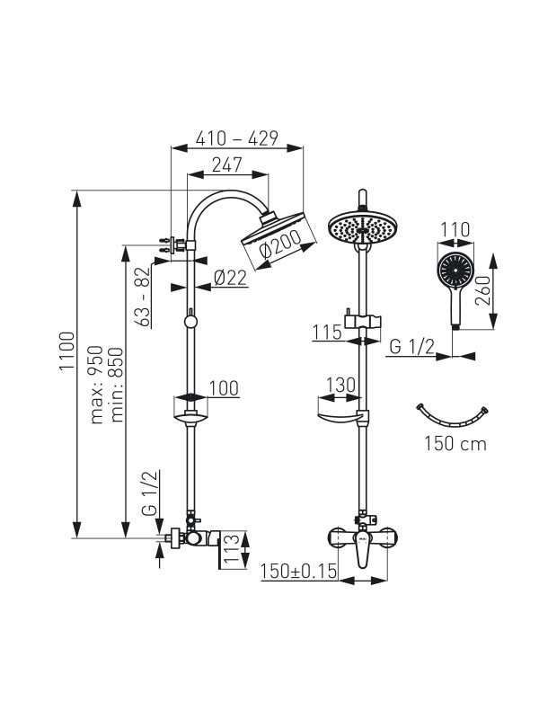 • G1/2 ekscentri  150 +/- 20 mm podesivi